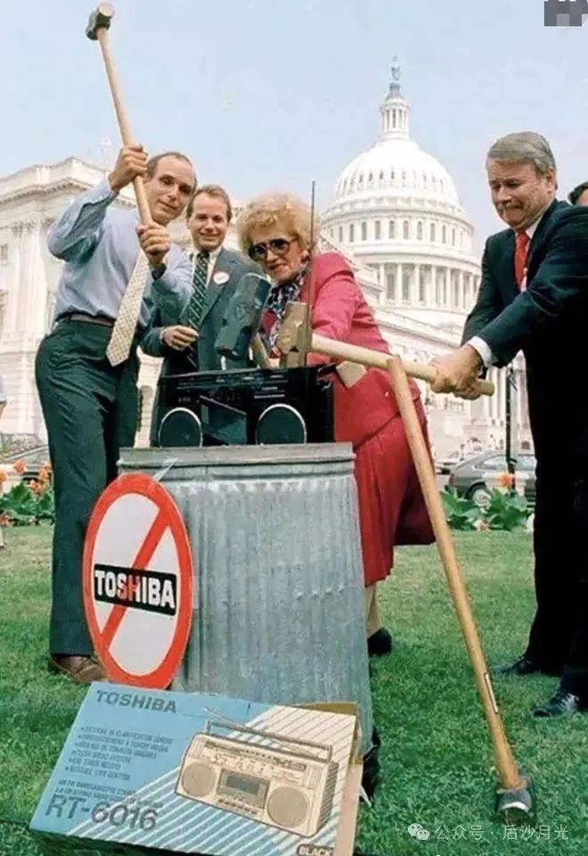 1982年,美國議員在白宮門口打砸日本錄音機,社會上還有打砸日本車的美國人。輿論鋪墊到位後,美國的貿易保護就來了,歐洲跟進,夾擊日本。