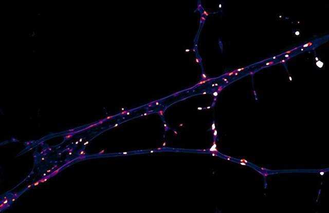 顯微鏡下的神經元圖像,高亮的結構是熒光標記的突觸蛋白