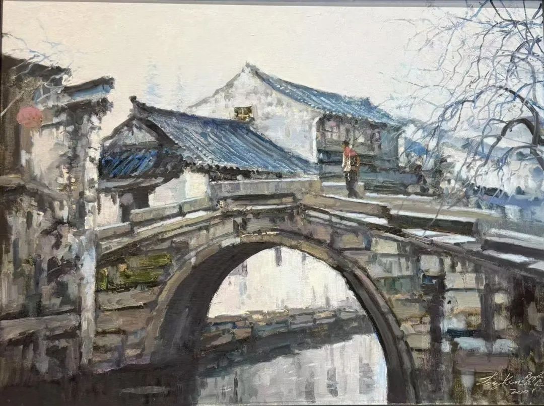 【海派匠心】雷震先生的創作,深植於海派藝術兼容幷蓄、精益求精的土壤。他巧妙地將西方油畫的寫實技巧與色彩表現力,融匯於東方美學的意境營造與留白哲思之中。畫面既有油彩的強烈視覺衝擊,又流淌着江南特有的温婉、含蓄與詩意。每一道筆觸都承載着思考,每一層色彩都經過精心調配。你能在畫作的細節中,感受到藝術家對光影、空間、材質的極致追求。他筆下的江南,不僅是小橋流水的復刻,更是對江南人文精神、歷史積澱與自然靈性的深刻感悟和藝術昇華。