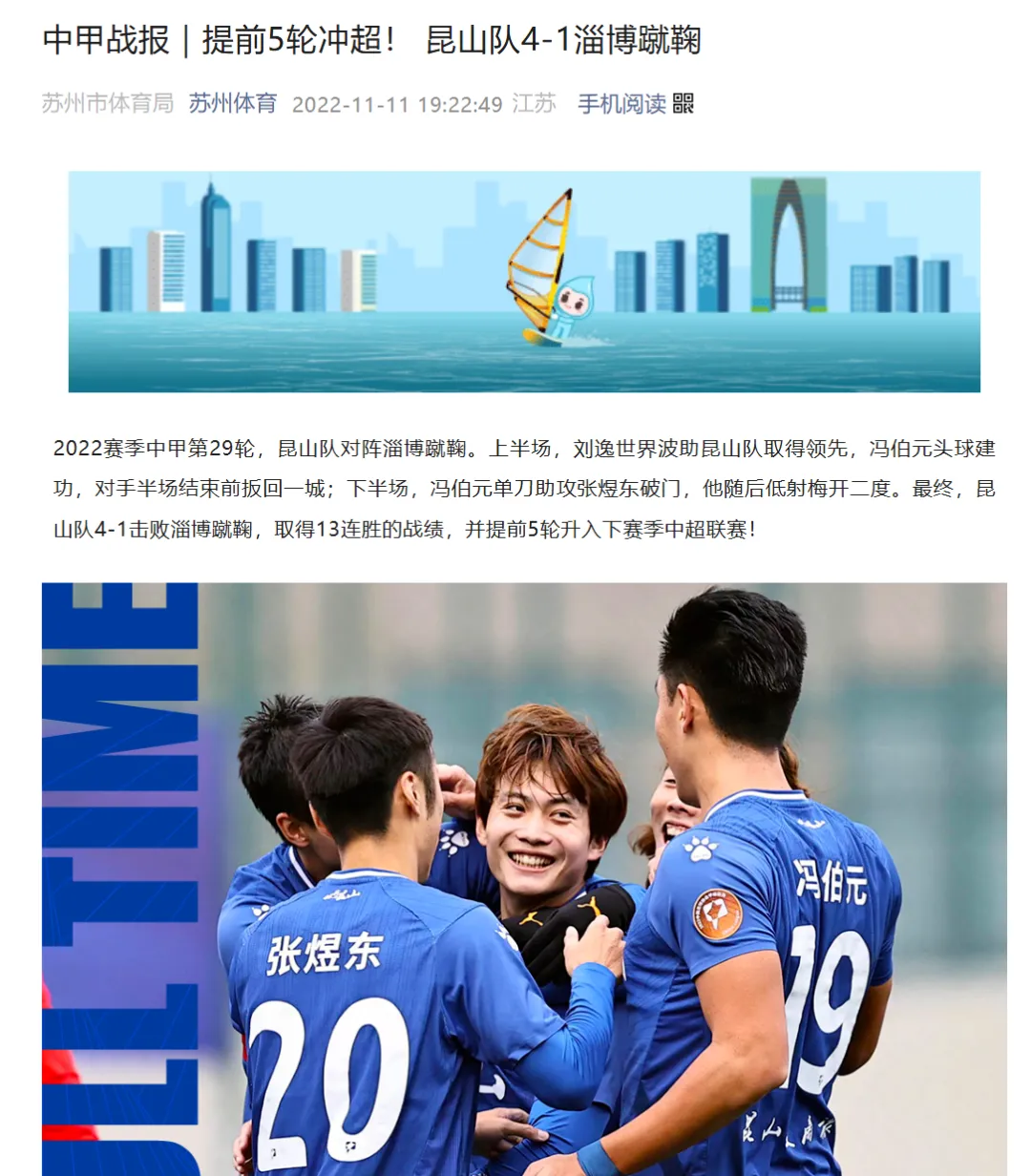 2022賽季第29輪,崑山FC4比1大勝淄博蹴鞠,以創紀錄的24勝5平的不敗戰績,提前5輪鎖定衝超名額,在蘇寧退出2年後,成為又一支擁有中超資格的江蘇球隊。