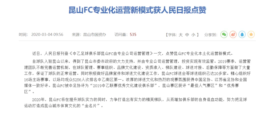 當然,理想和現實還存在一些差距,球隊僅列中乙聯賽第9,距離中甲目標還相去甚遠。不過《人民日報》卻對這支低級別球隊給出了罕見的好評:這傢俱樂部的運營模式值得關注,球隊得到了崑山市委市政府支持,並由專業公司運營管理。此模式保證了由專業人做專業事,改變了以往管理不專業的弊端,同時又讓投資得到有效監管。