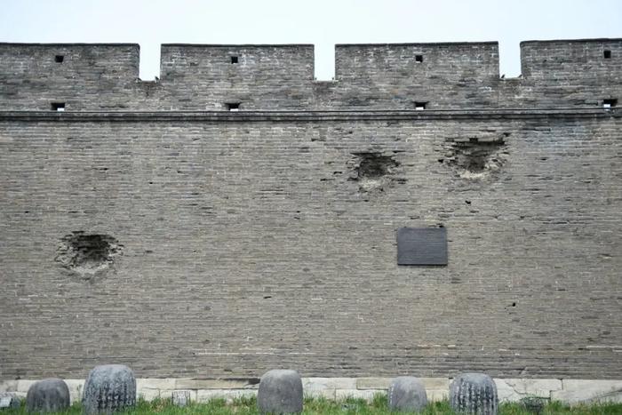 這是2024年7月4日拍攝的宛平城城牆上的彈坑遺蹟。新華社記者張晨霖攝