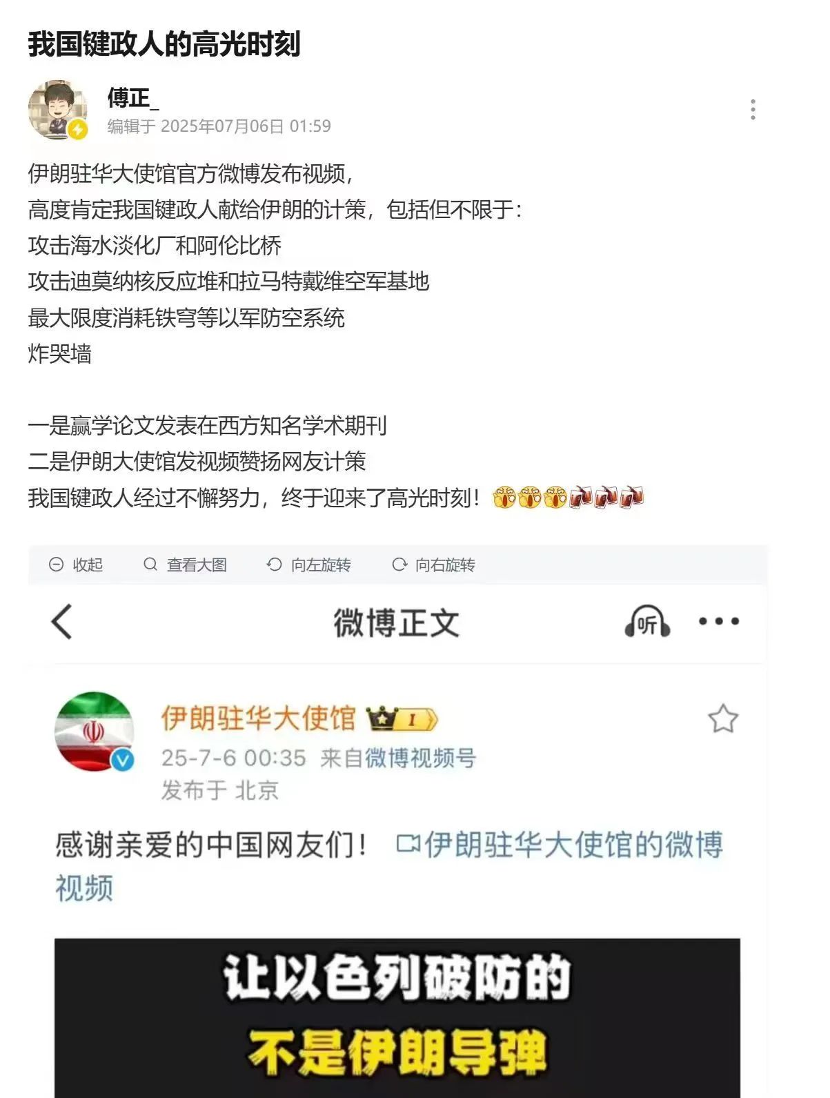 ·草根智慧的“國家認證”:大使館視頻的戰略深意伊朗駐華大使館的視頻,是一份具有多重意義的戰略文書。首先,它是最高級別的“價值確認”。伊朗作為中東抵抗軸心的核心力量,其情報與軍事機構絕非等閒。他們有能力在全球範圍內篩選信息。選擇公開引用中國網友的計策,**意味着這些建議在專業層面被認為具有可行性、威脅性和戰略價值,而非無稽之談。**其次,這是對以色列及其盟友的“認知威懾”。視頻明確傳遞信號:**伊朗不僅擁有本土導彈庫,更擁有來自東方、難以預測、充滿創造力的“思想彈藥庫”。**這種“未知的未知”(Unknown Unknowns),足以讓對手的防禦計劃陷入癱瘓——你永遠不知道下一個從“中國鍵盤”裏飛出的會是什麼“奇招”。最後,這是對全球反以/反霸權力量的“統戰宣言”。視頻將中國網友置於“同志”位置,巧妙地將中國龐大的網絡民意與伊朗的抗爭敍事捆綁,在中東地緣棋局中,無形地為中國嵌入了一枚極具分量的“親伊朗”情感砝碼。此舉堪稱21世紀數字外交與認知作戰的經典案例。