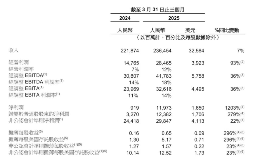 阿里巴巴第四財季(注:阿里巴巴財年與自然年不同步,2024年4月1日至2025年3月31日為2025財年),營收為2364.54億元,同比增長7%。不按美國通用會計準則(non-GAAP),淨利潤為298.47億元(約合41.13億美元)。