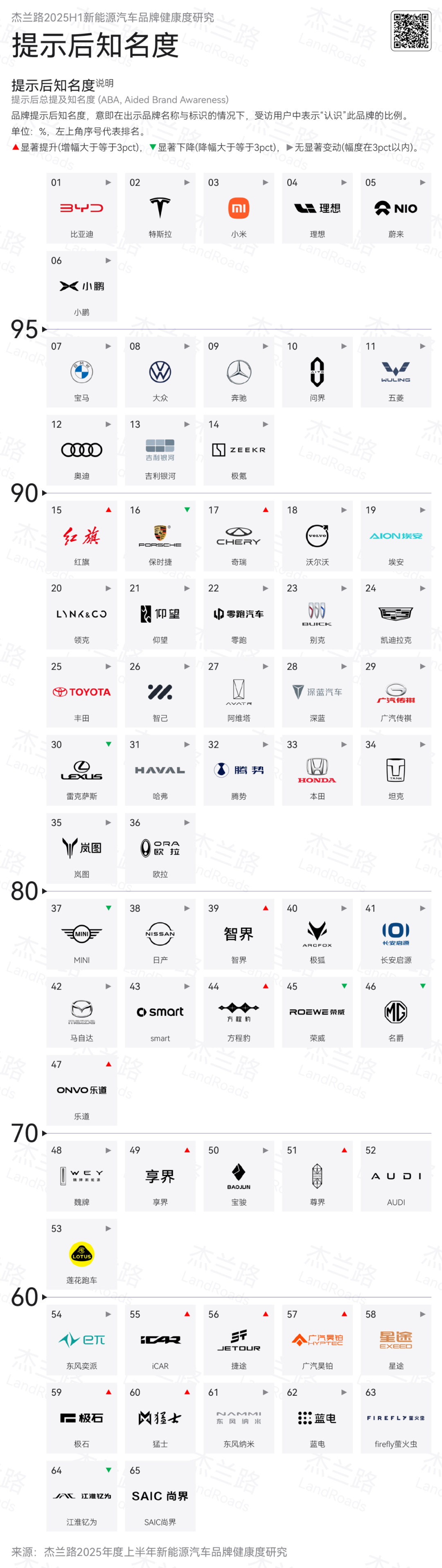本期是傑蘭路自2021年開展新能源汽車品牌健康度研究以來的第七期追蹤,調研覆蓋了65個新能源汽車品牌,詢問了超過8,200名新能源車主用户的意見。值得注意的是,這也是該系列研究開展以來監測品牌數量首次出現回落。