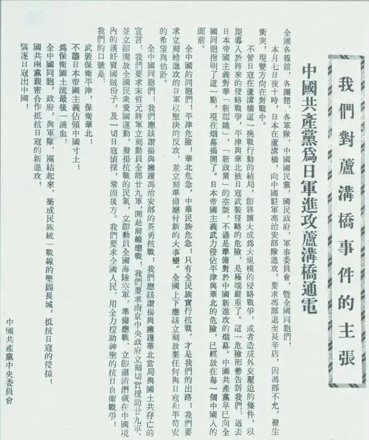 1937年7月8日,盧溝橋事變第二天,中共中央向全國發出通電:“平津危急!華北危急!中華民族危急!只有全民族實行抗戰,才是我們的出路!”同日,毛澤東、朱德、彭德懷等紅軍領導人致電蔣介石,表示紅軍將士願意“為國效命,與敵周旋,以達保土衞國之目的”。