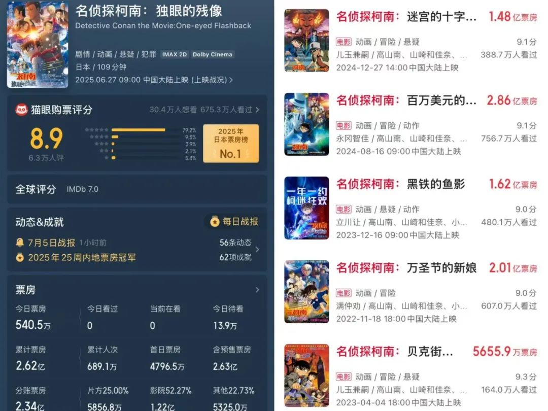 但咱們這邊《名偵探柯南:獨眼的殘像》的表現,卻有點未映先火的意思。待真上映了,口碑倒也並不如何炸裂。反而因為“近十年最好劇場版”的口號抬高了不少人的期待,看完覺得不過爾爾。