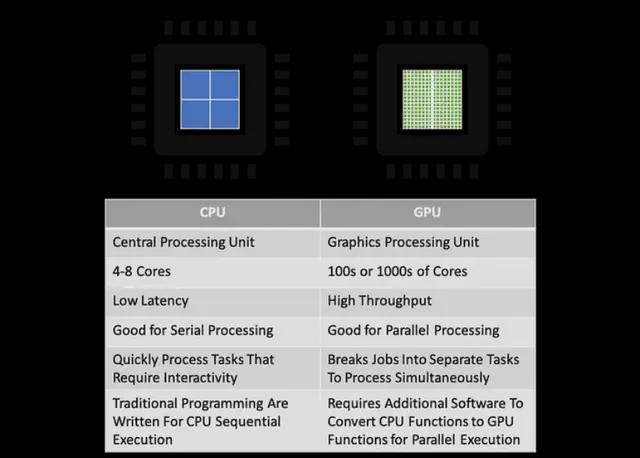 CPU(中央處理器)託管少數針對順序、邏輯複雜的任務進行了優化的複雜內核,而GPU 則擁有數千個旨在並行處理數據的簡單內核。每個 CPU 核心都具有強大的單線程性能和複雜的控制邏輯。然而,現代 AI 訓練和推理涉及處理數 TB 的參數和中間激活,遠遠超出了幾個 CPU 內核可以有效處理的範圍。