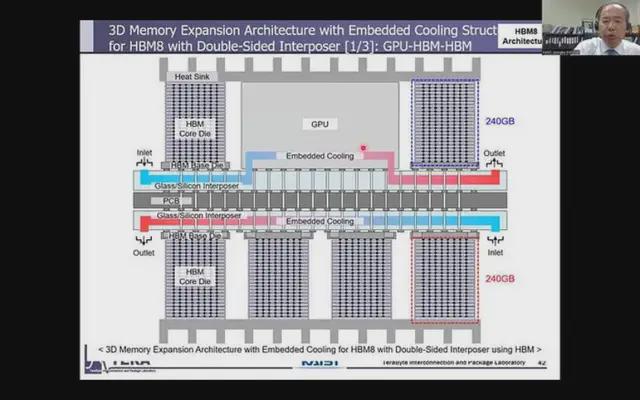 HBM8 增加了一種複雜的芯片複合材料,它不僅利用了HBM 內存封裝的正面,而且還在背面集成了存儲擴展。此外,熱管理將緊密集成到結構中,以應對日益增長的熱量挑戰。