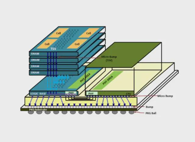 每個DRAM 芯片都使用極薄的粘合劑材料進行粘合,最初通過微凸塊在各層之間互連。