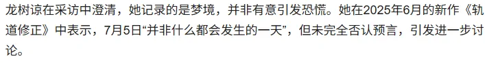 目前,作者和她的書依舊有熱度,但隨着7月5日越來越近,作者本人的説法也變了。她在採訪和新書裏表示:當初出完整版並非本意,而是出版社要求的。至於7月5日會發生大災難,作者表示“不一定”。
