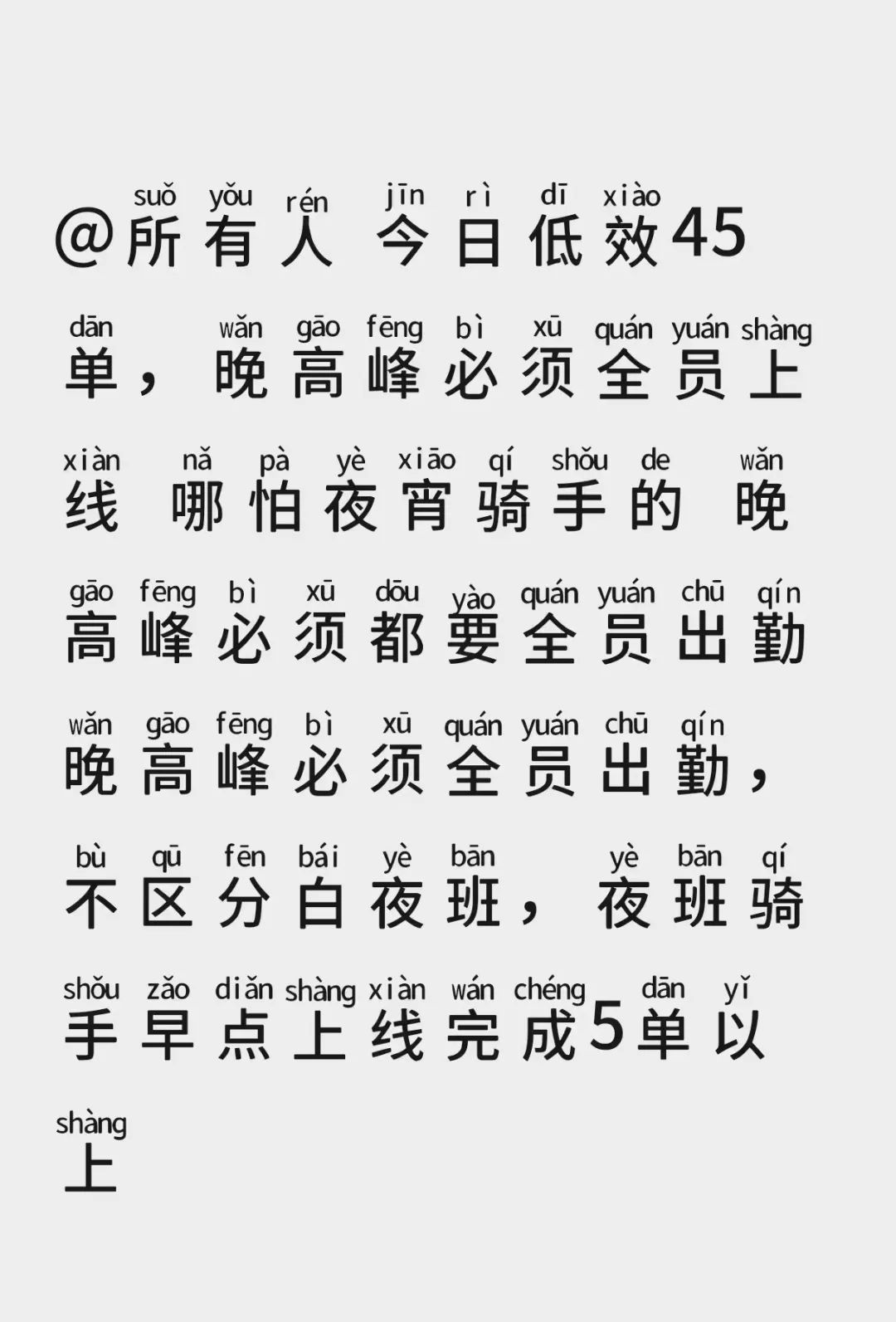 “晚高峯必須全員上線,不分白班和夜班,哪怕是夜宵騎手,也要全員出勤。”小星今天打開美團外賣站點工作羣,就看到負責人通知所有外賣員,作為夜宵騎手,他此刻也被裹挾在加班的洪流裏。“我並不喜歡平台的補貼活動,站點還要求跑滿40單。”小星告訴《IT時報》記者,40單標準是站點配合外賣訂單量增加而設定的當日工作量,要求必須完成,若多次不完成就會有被開除風險。
