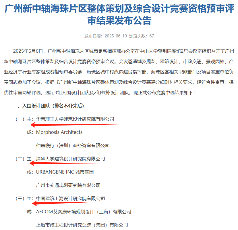 就在最近,廣州新中軸海珠片區整體策劃及綜合設計競賽資格預審名單公佈,3組入圍團隊分別是:華南理工設計院、清華大學設計院、中建上海設計院。