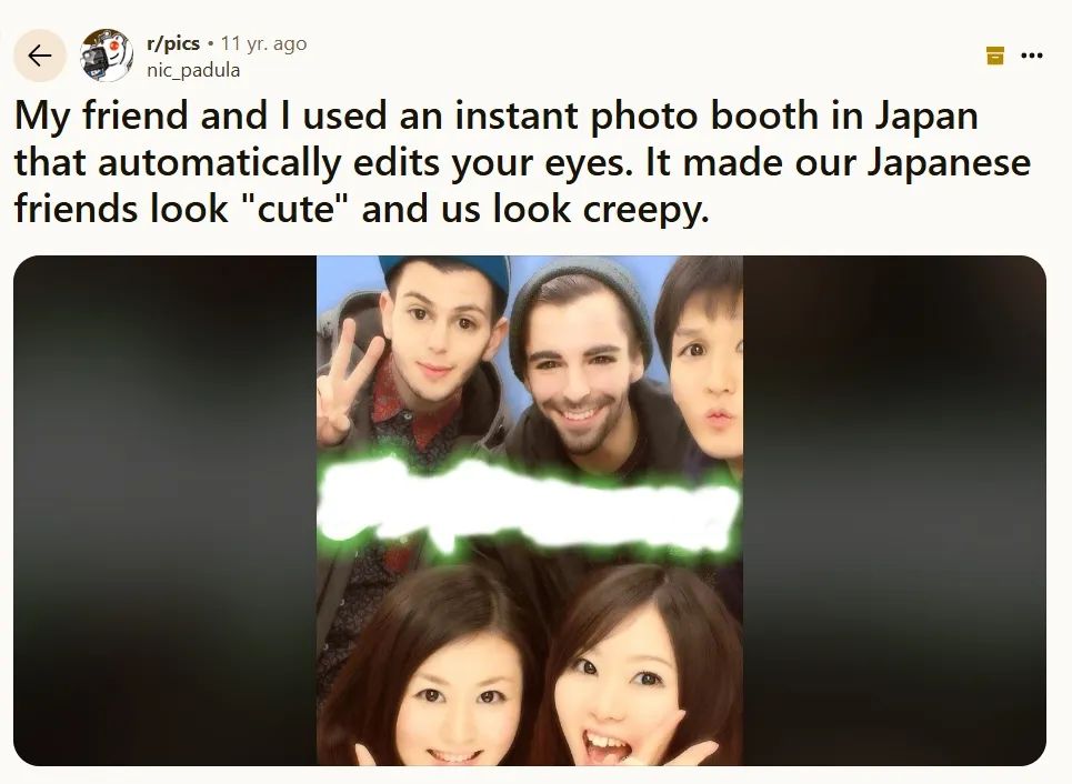 其實早在11年前,這些大頭貼的跨國潛力,就初現端倪了。當時在reddit上有個六千讚的帖子,説兩個老外去日本照了奇怪的照片,他們的日本朋友在照片上看着很“可愛”,但他們看着卻像是上帝在造人時突發腹瀉。