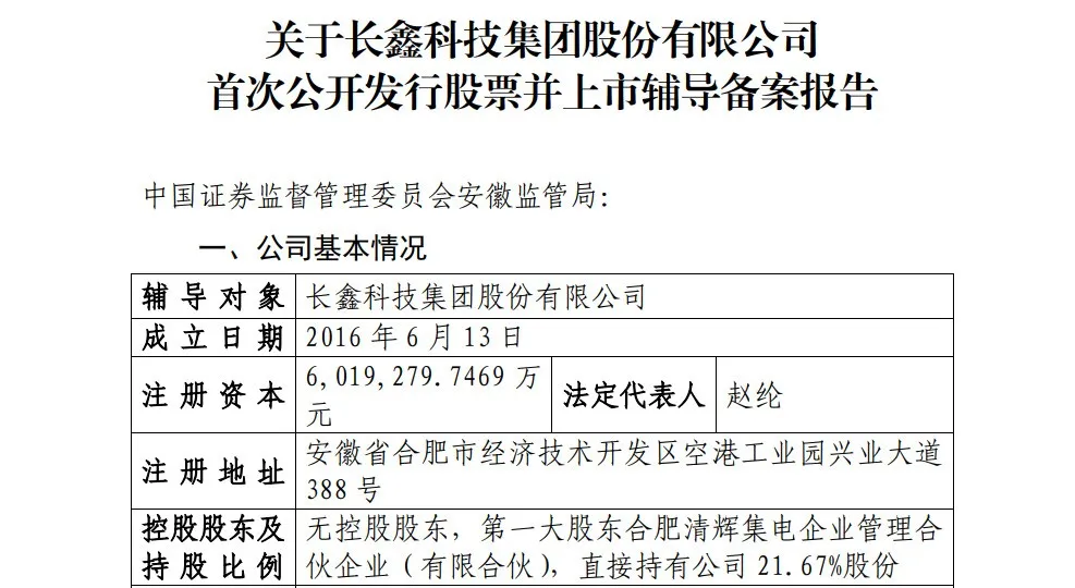 7月7日,中國證監會官網顯示,國產DRAM存儲器大廠長鑫科技集團股份有限公司的IPO輔導備案申請獲安徽證監局受理,輔導機構為中金公司、中信建投證券。官方資料介紹,長鑫存儲成立於2016年,主要從事動態隨機存取存儲器(DRAM)產品的研發、設計生產及銷售。公司註冊資本達601.9億元,無控股股東。第一大股東為合肥清輝集電企業管理合夥企業(有限合夥),直接持有公司21.67%股份。