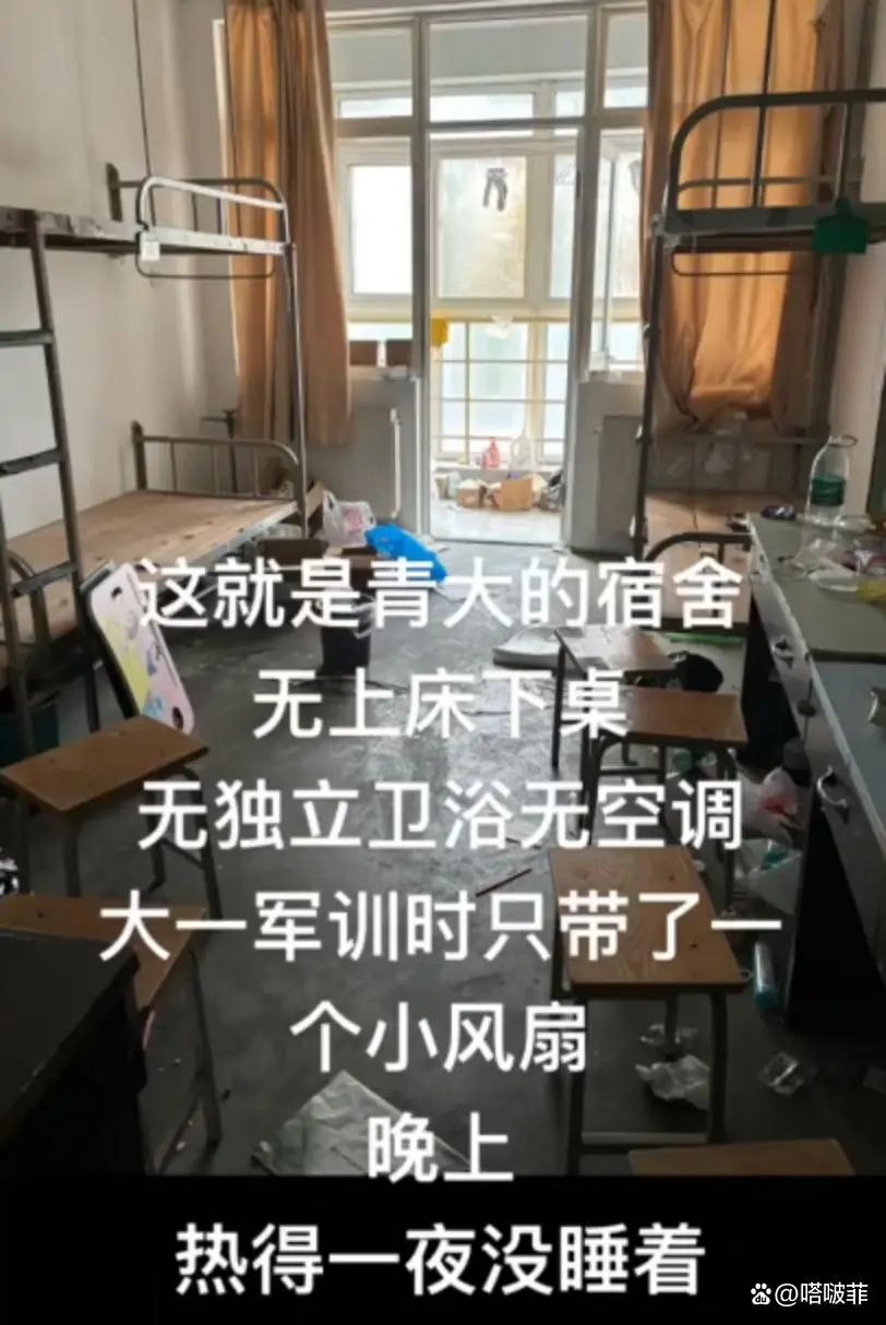 學生們的住宿情況也好不到哪裏去,有學生貼出寢室照片,艱苦的環境和高大上的行政樓形成鮮明對比。