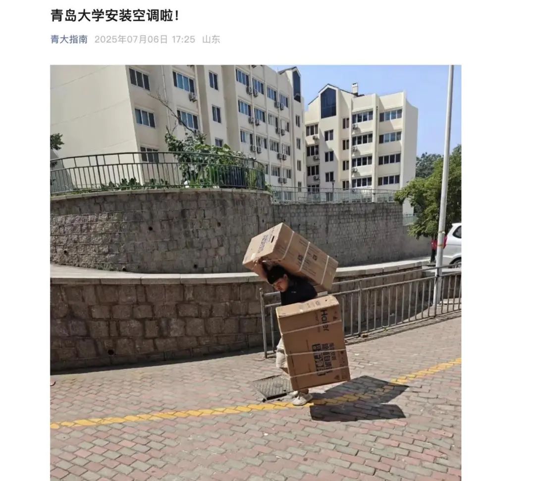 就在大爺不幸過世當天下午,有自媒體稱青島大學已安裝空調,有網友將兩件事進行關聯解讀,引發外界關注。而青島大學後勤處接線工作人員告訴極目新聞記者,學校原本就有給學生公寓這個暑期安裝空調的計劃,具體施工進度暫不清楚。不是因宿管大爺不幸身亡事件發生才裝的。