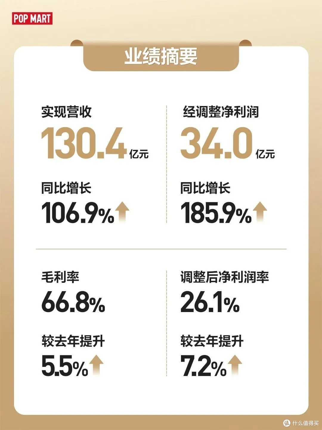 在當今的消費市場中,泡泡瑪特無疑是一顆耀眼的明星。從 2010 年創立至今,短短十餘年,它便構建起了一個龐大的潮玩帝國,在資本市場和消費市場都掀起了驚濤駭浪。2024 年,泡泡瑪特實現營收 130.4 億元,同比增長 106.9%;經調整淨利潤 34.0 億元,同比增長 185.9% 。