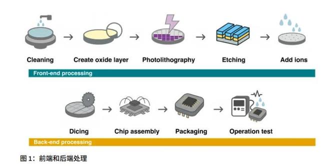 芯片製造的晶圓或前端工藝始於氧化層,然後使用光刻技術(包括抗蝕劑塗覆、曝光和顯影)繪製圖案;蝕刻零件;添加離子;創建金屬層和絕緣層;以及平滑表面。這些步驟重複多次,以構建複雜的電路層。在前端處理(圖1)中,在同一晶圓上重複這些步驟,以構建構成集成電路 (IC) 的零件和連接。