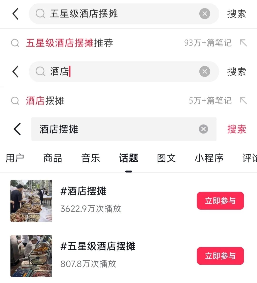 最近,“星級酒店擺攤”的話題刷屏了社交網絡。截至7月7日,小紅書上關於“酒店擺攤”“五星級酒店擺攤”等相關筆記數已超過百萬。而在抖音上,關聯“酒店擺攤”的相關視頻播放量也突破3千萬。
