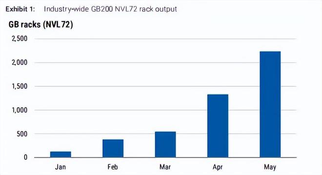 近期數據,2025年5月GB200 NVL72機架的全球總產量估計達到2000至2500台,較4月的1000至1500台顯著增長,預計6月出貨量將繼續攀升,第二季度整體產量有望達到5000至6000台。