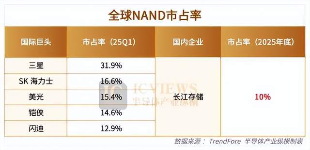 對標存儲巨頭來看,DRAM領域裏,2025年Q1三星市佔率33.7%、海力士36%,美光市佔率24.3%。NAND領域裏,2025年Q1三星電子市佔率31.9%、海力士16.6%,鎧俠14.6%,美光15.4%,閃迪12.9%(取代了西部數據)。