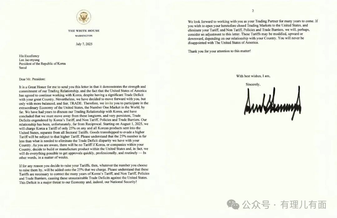 當地時間7月7日中午12點整,特朗普的“關税最後通牒”——14封除了抬頭、收信人名稱、税率不同,內容幾乎一模一樣的“加税信”——陸續在個人社交平台“真相社交”上正式發出。信上特朗普特有的“火柴棍”式簽名,倒是相當的醒目。