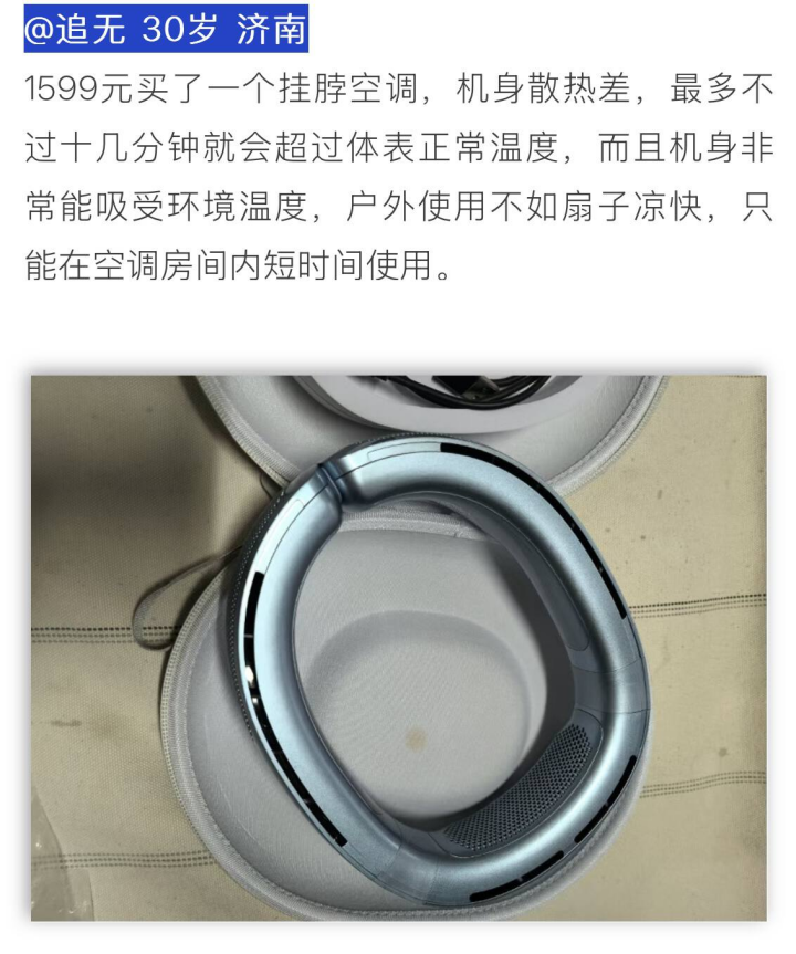 他們不惜高價買掛脖空調等裝備,結果發現存在散熱差、户外不如扇子涼快等缺點。