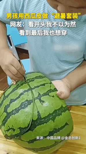 有男孩用西瓜皮做了避暑套裝,從頭到腳“全副武裝”。