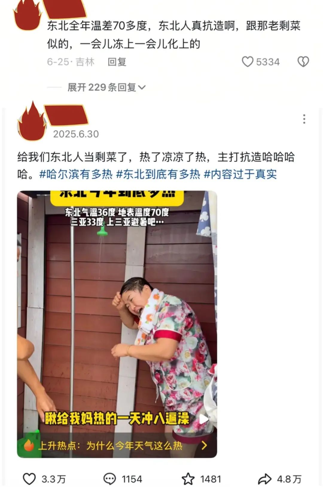 “誰給我們東北人當老剩菜了,一會凍上,一會化上的,給我媽熱得一天衝八遍澡”;
