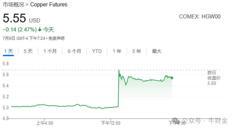 7月9日牛財金消息,特朗普在白宮放話:美國即將對銅進口徵收高達50%的關税!消息一出,紐約期銅盤中暴漲17%,衝上歷史天價,每磅一度飆到 5.8955美元,比倫敦銅期貨溢價高達25%,刷新全球金屬市場紀錄。