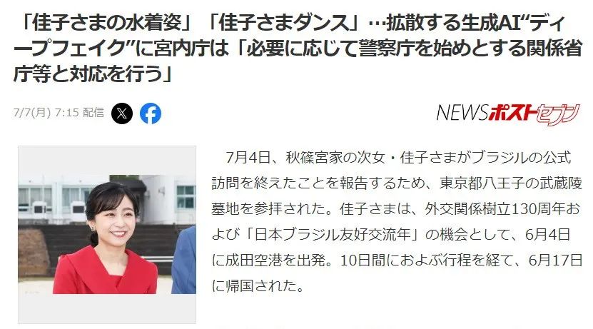 “佳子公主泳裝照”、“佳子熱舞”視頻瘋傳,日本宮內廳就AI深度偽造表態:“將視情況聯合警視廳等相關部門處置”。