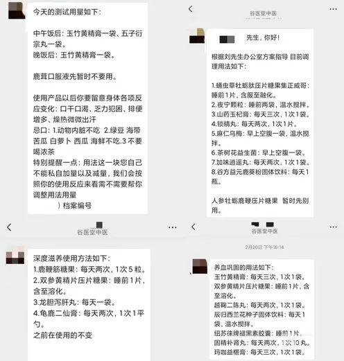 為了一探究竟,記者以患者身份撥打了谷醫堂官網的線上銷售諮詢服務熱線進行諮詢,不一會兒,對方的一名健康顧問來電稱,可以加微信進行詳細介紹。聊天中,該顧問首先簡單詢問了記者的身體情況,隨後便開始推介自家產品,宣稱可以“對症搭配名醫膏方以及中成藥輔助調理”,“一個週期20天左右”。見記者無動於衷,對方便開始給記者發送擦邊圖片以及性暗示語言。