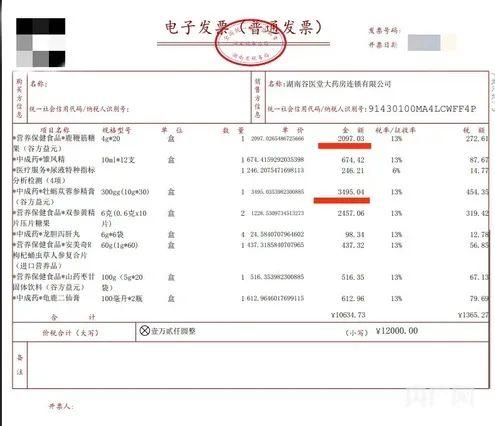 李先生向記者出示的電子發票記錄顯示,在理療師劉某的指導下,其依次購買了5500元、12000元、6300元的藥品,共計23800元,其中,發票中標明屬於“營養保健食品”的價格達15878.91元,比總價的三分之二還多。不算税額,單價最貴的“營養保健食品”是鹿鞭筋糖果,平均一顆4克的糖果近105元;單價最貴的“中成藥”是牡蠣蓯蓉參精膏,平均一盒近3500元。