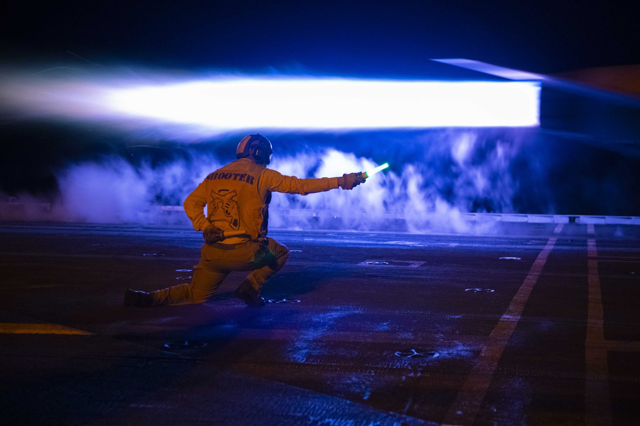 Greiner)發出信號,指示隸屬於攻擊戰鬥機中隊(VFA)105“槍手”(Gunslingers)的一架F/A-18E“超級大黃蜂”戰鬥機起飛。美國海軍供圖