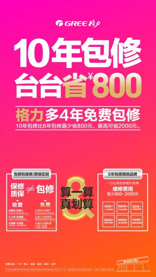 但是,購買格力空調的消費者的內心則多了一絲篤定:因為格力承諾“10年免費包修”。也就是説,在購買格力全系家用空調產品之後的10年內,免費包修。與之對比,空調行業普遍包修期限僅為6年。