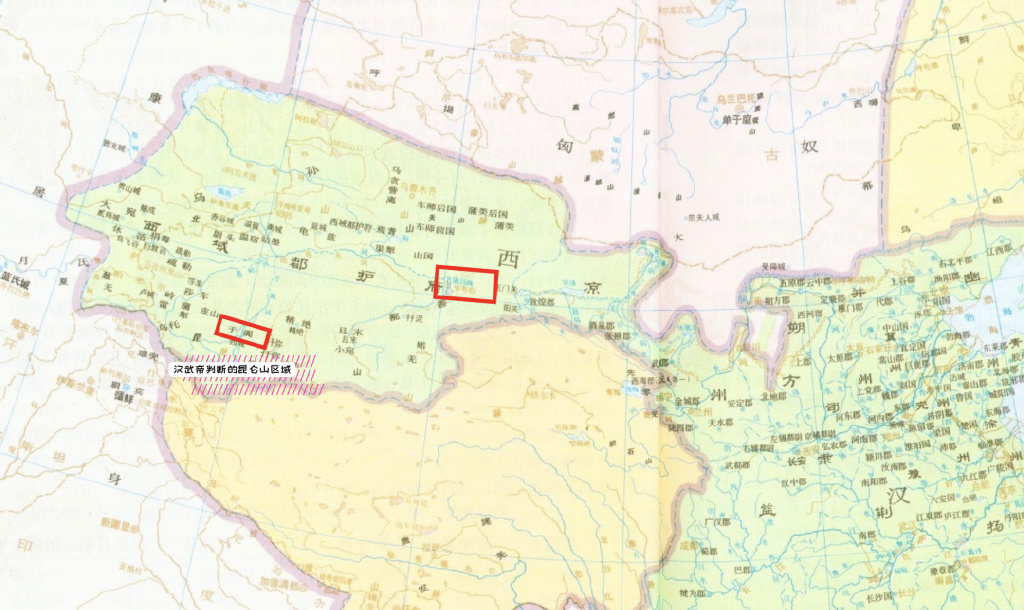 對漢代所判斷的黃河源地及崑崙山地理位置的大致標註 底圖來源:《簡明中國歷史地圖集》
