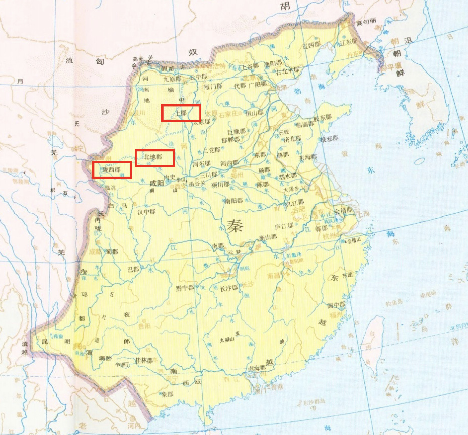 秦朝地圖中對隴西郡、北地郡、上郡的着重標註 底圖來源:《簡明中國歷史地圖集》