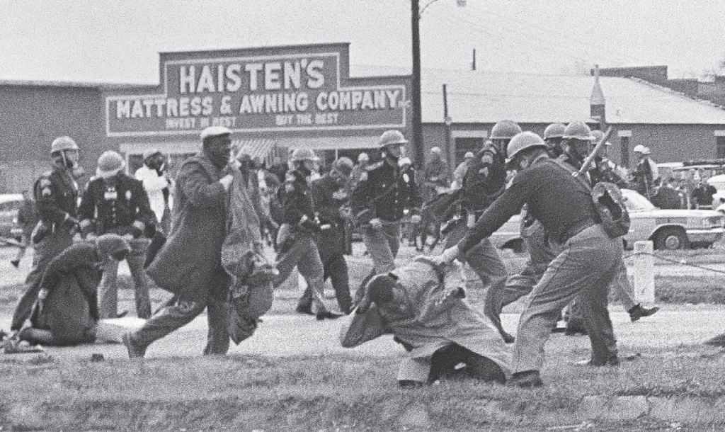 1965年3月,和平示威者試圖從塞爾瑪步行至蒙哥馬利,旨在爭取黑人投票權。3月7日,第一批約500人的遊行隊伍在途中遭到警察與白人暴徒襲擊,抗議者或遭毆打,或被催淚瓦斯驅散,許多人受重傷,該事件被稱為“血腥星期日”。圖為衝突場景 視覺中國/供圖