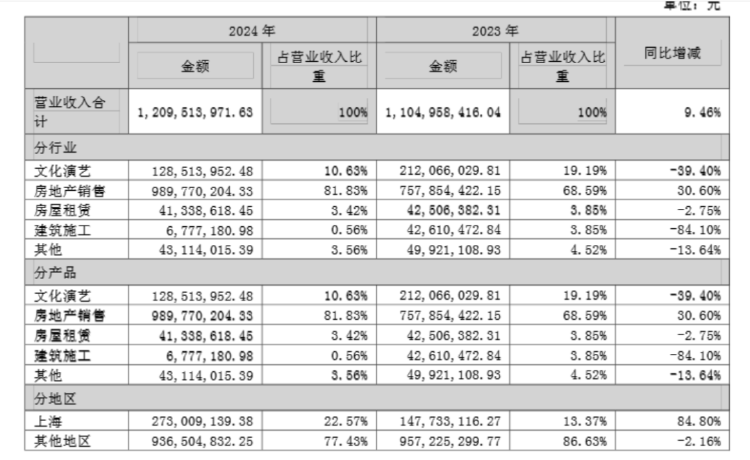 自2024年起,三湘印象業績有所回升。2024年,公司實現營收12.10億元,同比增長9.46%;實現淨利潤1927.79萬元,同比增長1459.91%。其中,房地產銷售依然是三湘印象最重要的收入來源。2024年,三湘印象房地產銷售收入9.90億元,佔總營收的81.83%。