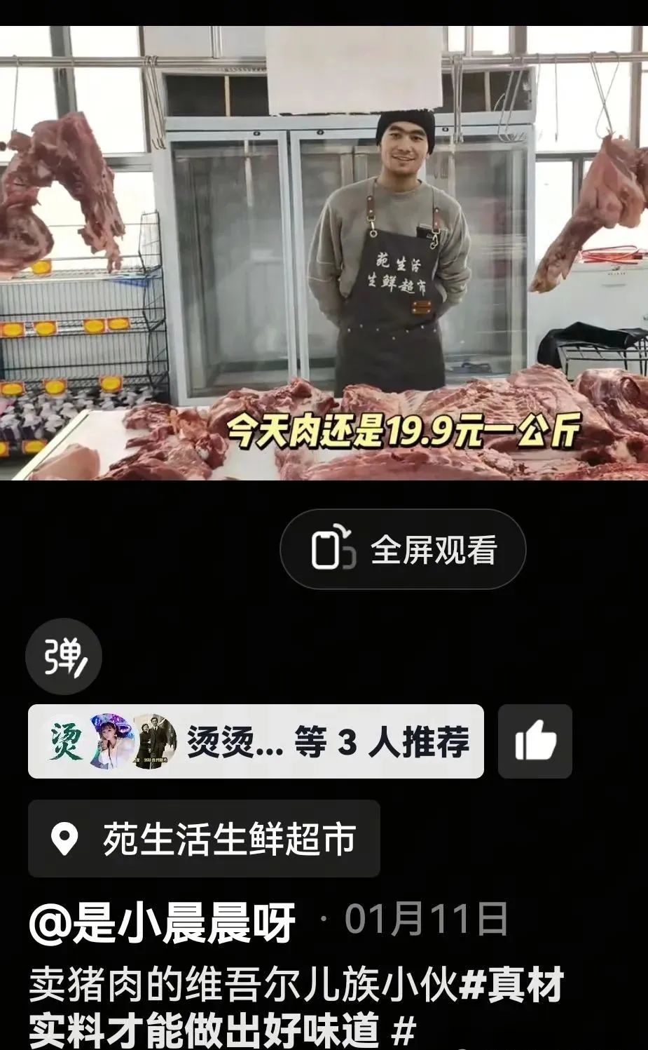 如今,各民族的飲食禁忌在實際生活中已經逐漸減少,飲食習俗正朝着世俗化和實用主義的方向發展。在城市化進程中,各民族聚居在一起,生活方式和生活環境發生了巨大變化。如下圖,新疆出現了賣豬肉的維吾爾族小夥子。(在作者生活的城市裏,超市裏賣豬肉的是一位漂亮的維吾爾族姑娘。)