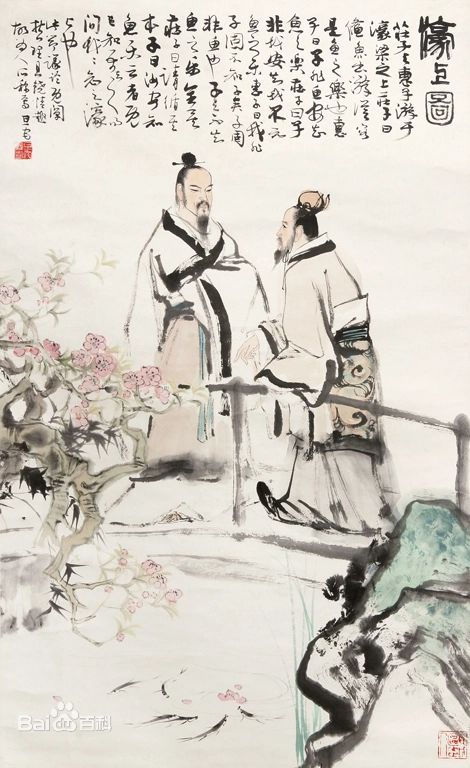 莊子與惠子游於濠梁之上。莊子曰:“鰷魚出遊從容,是魚之樂也。”惠子曰:“子非魚,安知魚之樂?”莊子曰:“子非我,安知我不知魚之樂?”惠子曰:“我非子,固不知子矣;子固非魚也,子之不知魚之樂,全矣!”莊子曰:“請循其本。子曰‘汝安知魚樂’雲者,既已知吾知之而問我,我知之濠上也。”