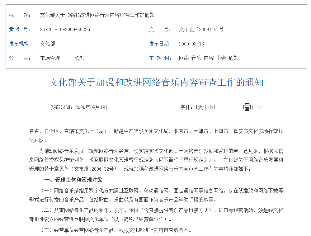 來到2009年,文化部印發《文化部關於加強和改進網絡音樂內容審查工作的通知》,為音樂行業帶來了第一次大洗牌。