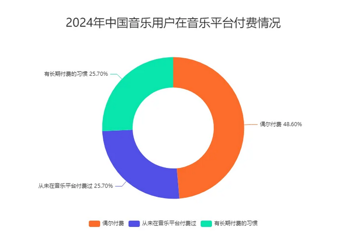 不過,根據《2024年中國音樂行業發展狀況與消費行為調查》報告,當前付費用户雖已成為數字音樂平台的重要組成,但整體比例仍偏低:48.6%的用户僅“偶爾付費”,真正具有長期付費習慣的用户僅佔25.7%,而另有25.7%的用户從未為音樂內容付費。