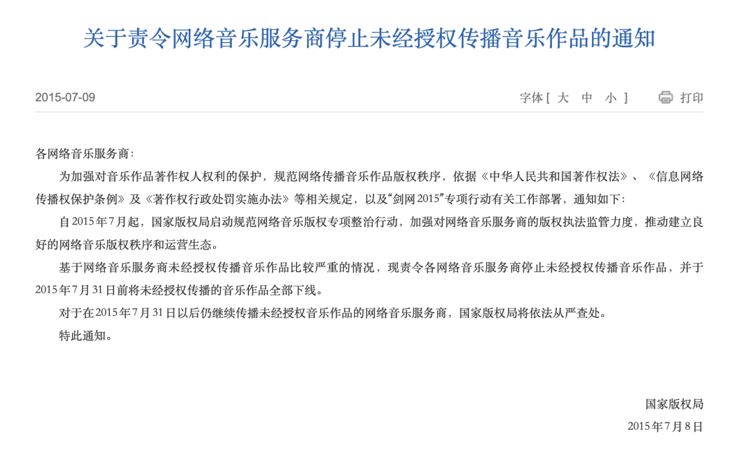 2015年,國家版權局下發《關於責令網絡音樂服務商停止未經授權傳播音樂作品的通知》,並要求7月31日前將未經授權傳播的音樂作品全部下線,都則國家版權局將依法從嚴查查處。