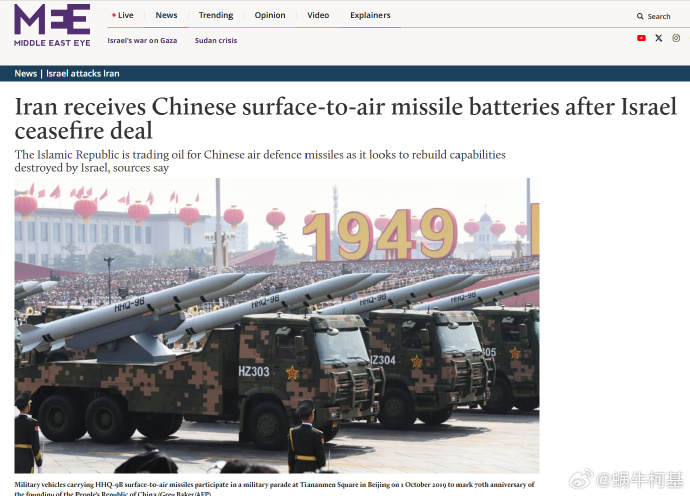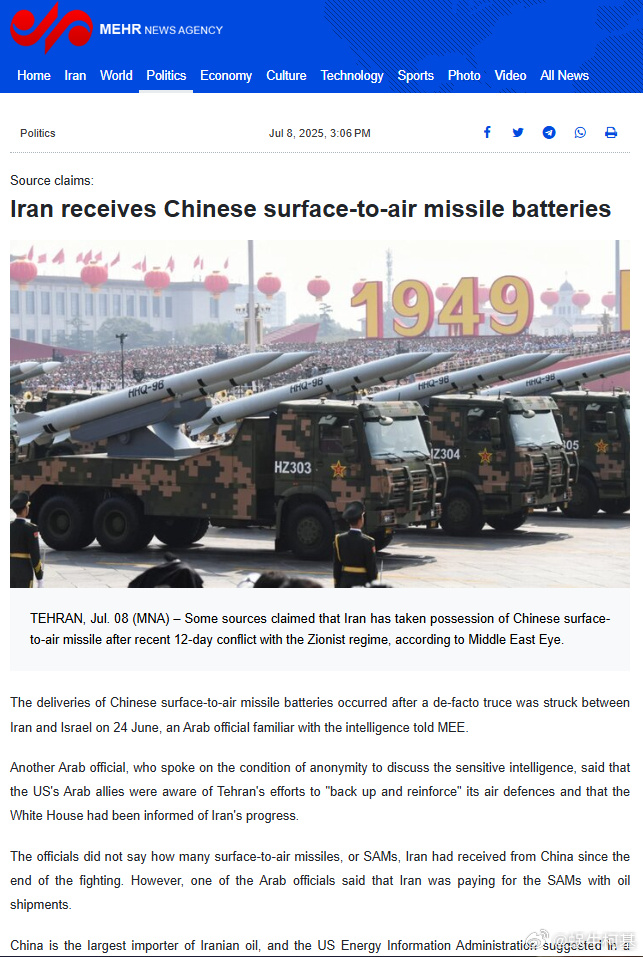 伊朗半官方的梅爾通訊社宣佈,伊朗接收了中國防空系統。