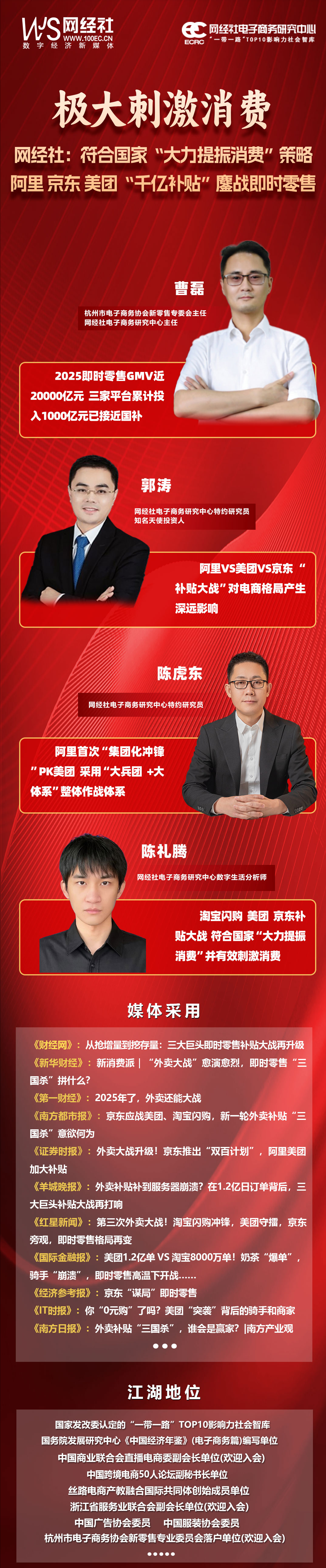網經社電子商務研究中心數字生活分析師陳禮騰表示,**在國家“大力提振消費”政策下,補貼策略直接且有效刺激了用户消費,是響應國家號召的舉措。**美團、淘寶閃購的數據揭示了即時零售市場的爆發潛力,**印證了“真金白銀”補貼對供需兩端的雙重激活,**非餐飲佔比的提升是平台從餐飲向全品類滲透的表現
