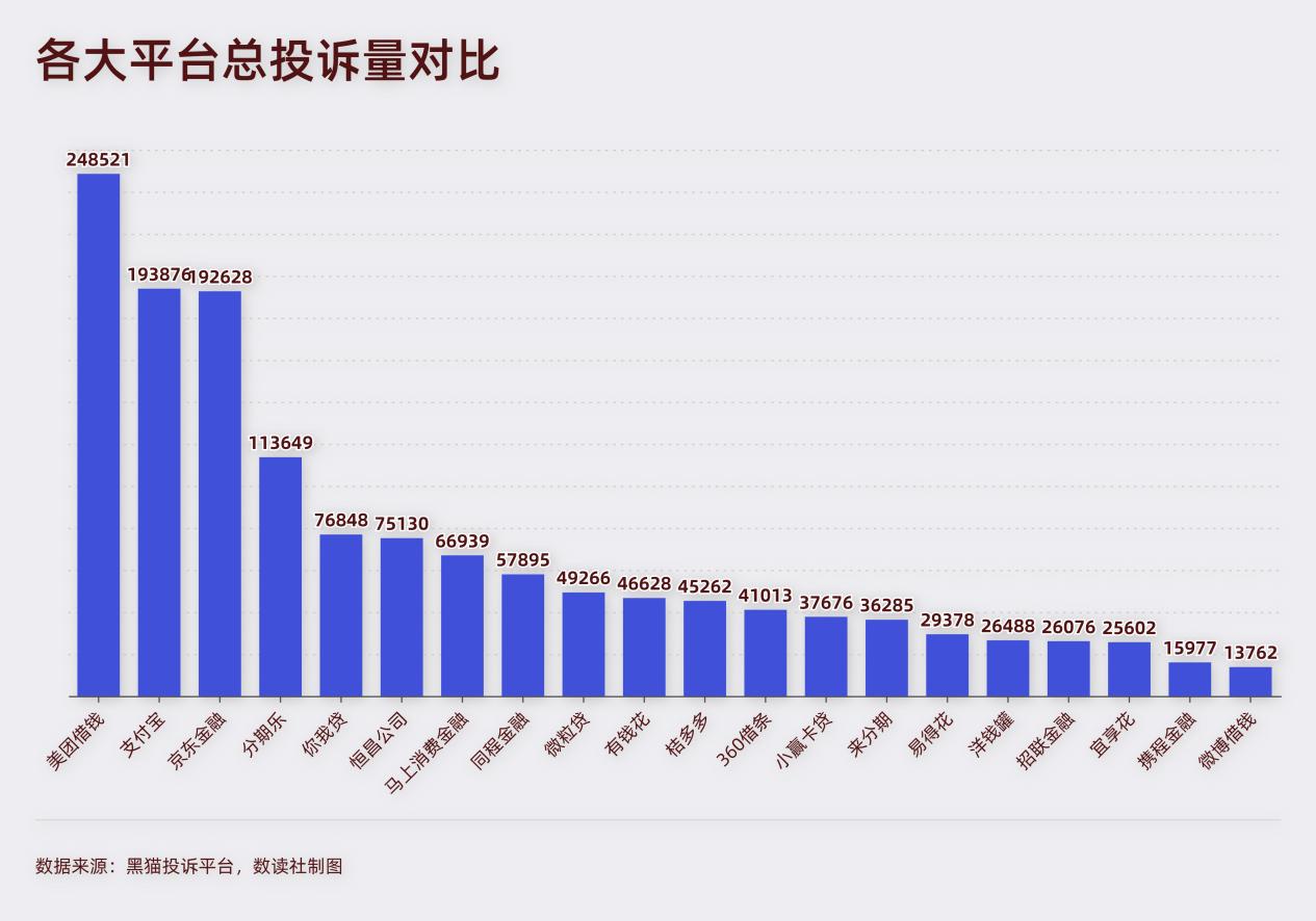 首先,投訴幾乎涉及所有平台。大平台用户基數大,投訴量高。不知名平台雖然用户量小,但投訴量同樣較大。20家平台中,平均投訴量高達7.1萬條,中位數也高達4.6萬條,4家平台投訴量超過10萬條,投訴量巨大。