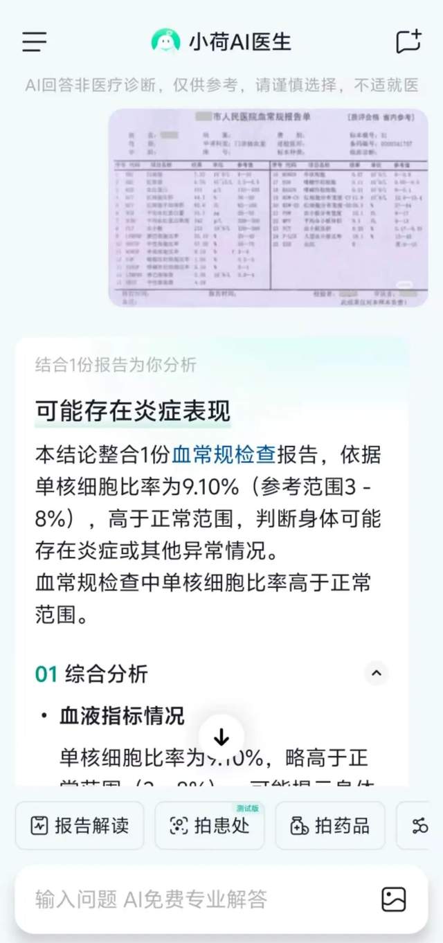 除了常規的健康諮詢外,小荷AI醫生也能對診斷報告進行解讀。血常規、尿常規、肝功能等化驗單一鍵拍照上傳,快速解析指標異常含義,結合檢查結果給出個性化分析。