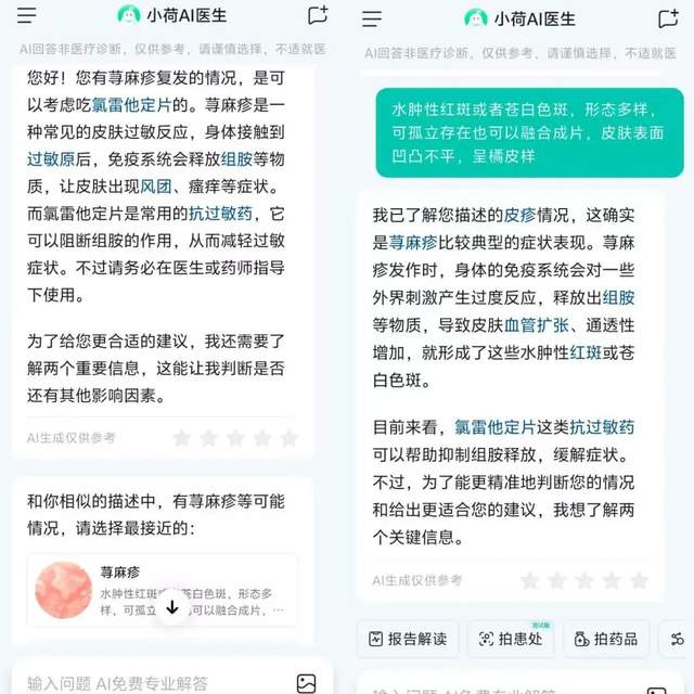 譬如,輸入“蕁麻疹復發,能吃氯雷他定片嗎”,小荷AI醫生並不繼續提出建議,而是會讓患者上傳診斷報告,並進行分析,緊接着,會對患者提出的用藥問題做出建議。為了進一步給出合適建議,小荷AI醫生會讓患者拍攝病灶的圖片,通過AI判斷蕁麻疹的嚴重程度,再結合診斷報告中的既往病史、過敏史等信息,綜合評估後給出更具針對性的用藥建議。
